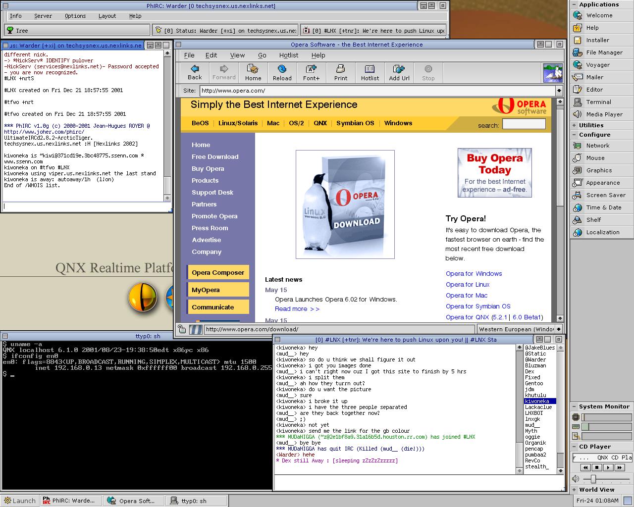 Next I tried few things with Freedos, Windows 3.11 (remembered the good old 386 times), Lindows SPX,QNX and finally Gentoo Linux. Nothing interesting about the first two. Lindows is basically a stripped debian with wine. I wouldn't buy it. QNX is another story. It's interesting *NIX OS. One of the things I liked about it was that it loads up really fast. You can install X, Gnome, gcc, etc. on it just like in Solaris but I never got to the part of gnome simply because photon looks nice [Screenshot 1 Screenshot 2] or at least hella better than CDE. Another thing about QNX is that it's really easy configurable, with good help included, which is nice thing if you never used the system before and/or you're lazy as I am :P However there are two major disadvantages. One being that there aren't lots of drivers which makes it difficult or impossible for some peripherals to work. The other is the lack of applications and diversity of choice even though some stuff was successfully ported (like mozilla for example), as you can see from the screenshots, and it's not that hard to port stuff to (at least it looks lots simpler than porting stuff to Solaris).